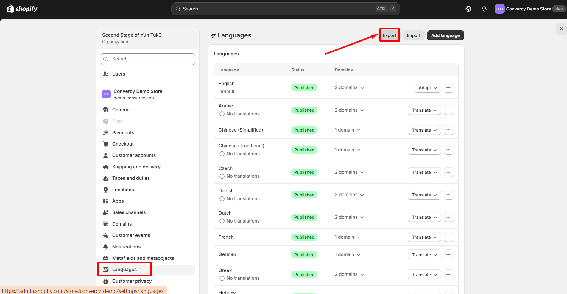 Currently, you can export translations directly from Shopify. To do this, please follow the steps below. Note that translations must be entered manually first in Convercy before exporting them.